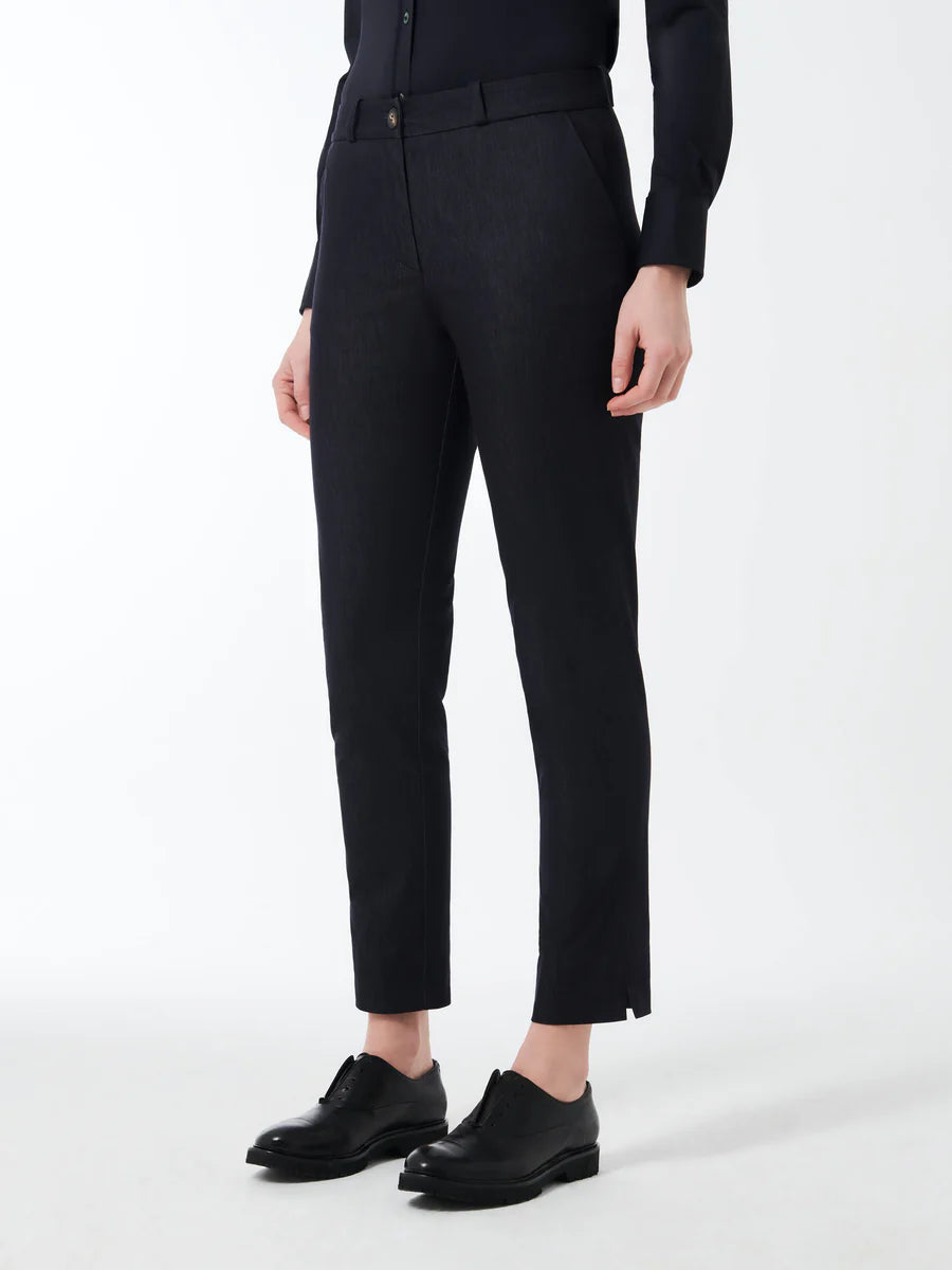 The Marina Chino Wom Pant combines the dynamism of stretch techno denim with the classic tailoring of chino pants in a design that is both classic and contemporary. With a tapered silhouette and impeccable aesthetics, this style features a regular loop waistband with a horn button and concealed zip fastening. French side pockets and slits at the ankles are distinctive details that enhance the minimalist style. Nimble and versatile, these trousers are available in a wide range of colors from navy and black to lighter tones, making them easy to transition from leisure to everyday casual. Pair them with tone-on-tone knitwear or the matching Marina overshirt for a sophisticated casual look.