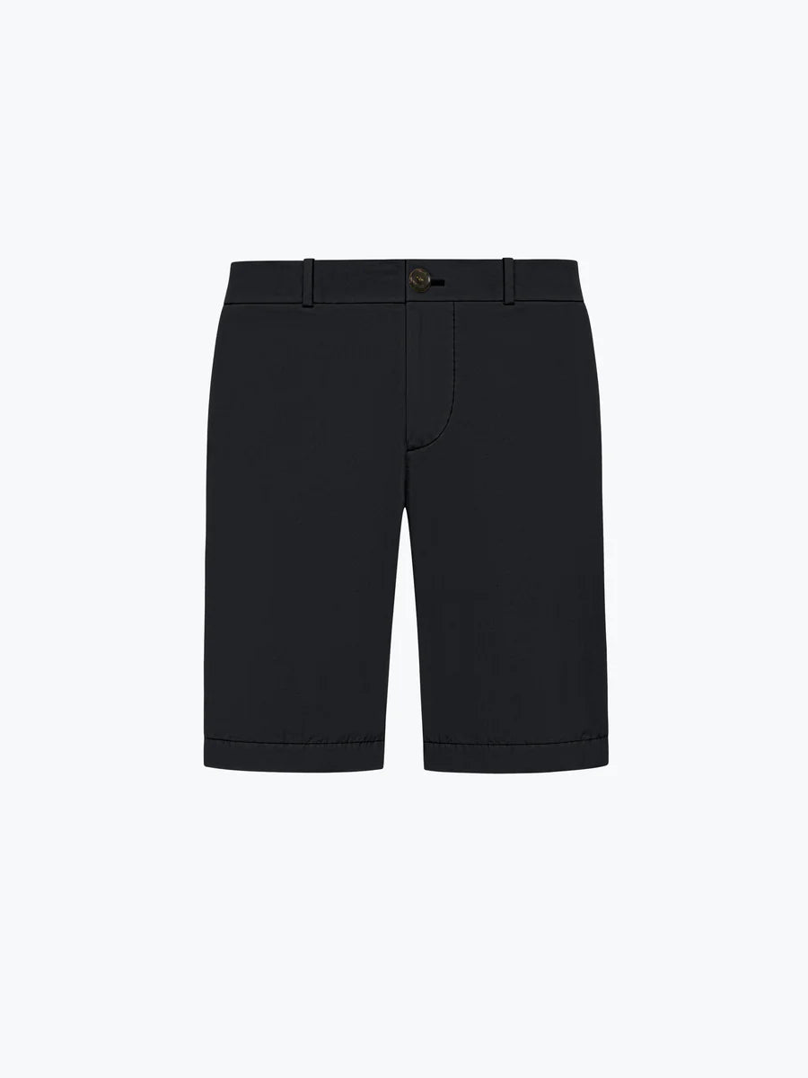 These over-the-knee Bermuda shorts are made distinctive by the slightly worn appearance of the lightweight, breathable and quick-drying stretch fabric. The simplicity and straightforwardness of the design are styled with the unexpected elegance of the tailored details, as seen in the horn button that closes the belt loop waistband, which is adjustable by a practical internal elastic drawstring. The zipper, concealed by a flap, is joined by side French pockets, complemented by the back welt pockets. The black micro-injected logo is a distinctive feature that adds to the style, sophistication, and comfort of this model, which is ideal for a refined urban casual look when paired with an Oxford Dyed Shirty or a Techno Wash Piqué Polo.