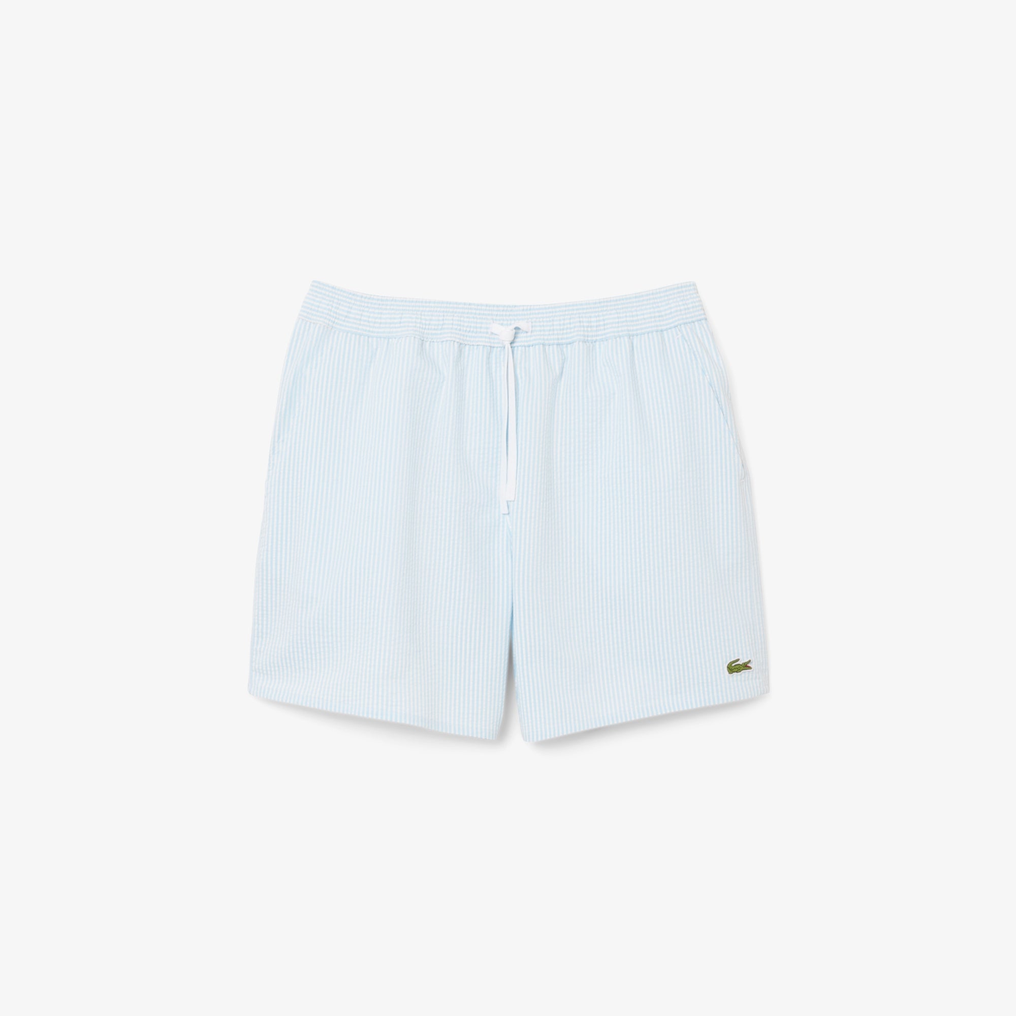 These mid-length swim shorts are an example of Lacoste elegance and expertise. Crafted from soft, textured seersucker fabric with integrated mesh lining for freedom of movement and a quick-drying finish, they feature narrow stripes and the signature embroidered crocodile for a casually chic feel. Available with a swim bag.