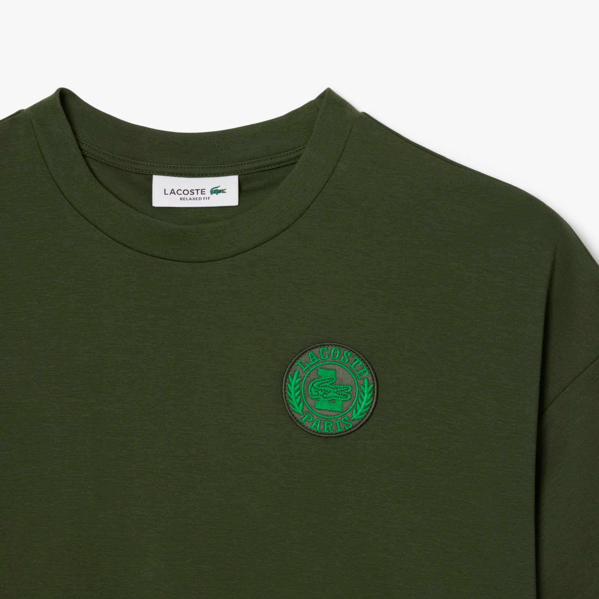 A T-shirt with many elegant expert touches from Lacoste, creator of sportswear since 1933. A comfortable interlock piece with a wide cut and an embroidered badge on the chest for signature style. A must-have with a refined touch, such as a ribbed collar.