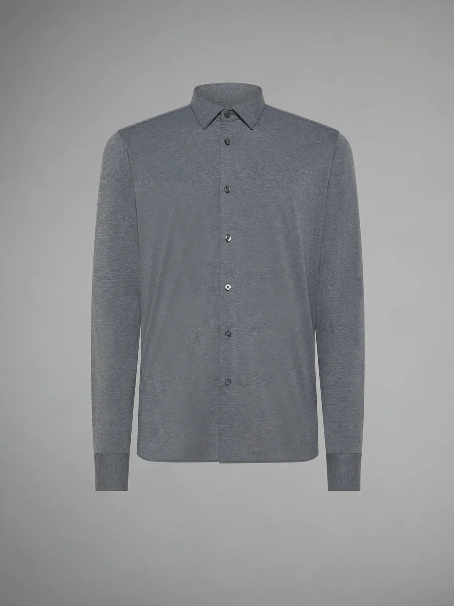 The shirt made of fine jacquard e-quickdry Oxford fabric features long sleeves and an elegant slim fit. The unique model is available in a wide variety of geometric micro-patterns. Refined style details such as the open collar, the French mother-of-pearl buttoning and the regulation of the double mother-of-pearl button cuffs make it ideal for completing a formal outfit for the day's meetings, or for the following evening. Its lightness and breathability, its quick drying, anti-crease and easy care qualities also make it a fresh and tireless traveller.