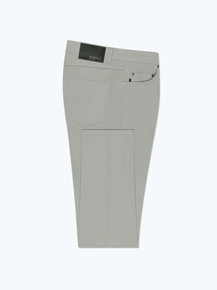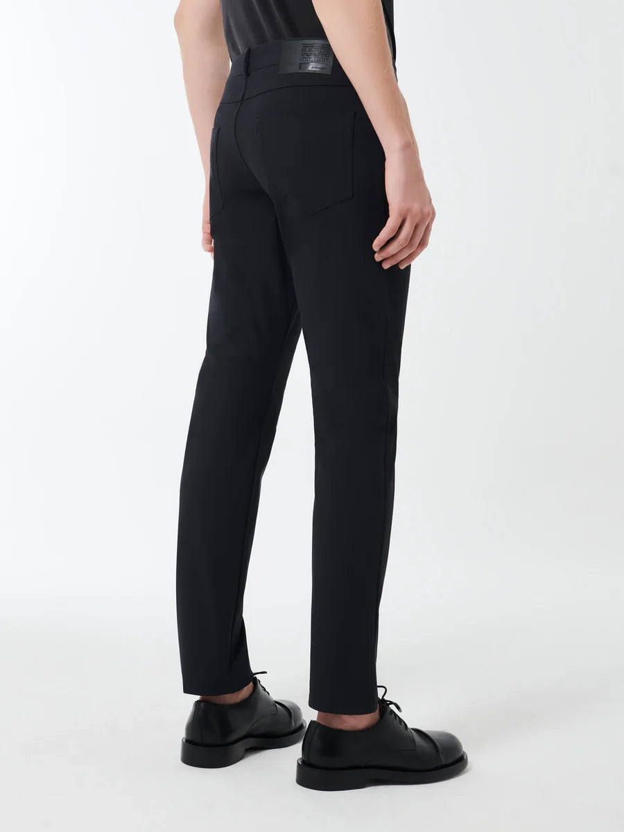 The Five-pocket pants find a new contemporary edge in the extreme lightness of cool, stretchy Surflex®. The fabric's sophisticated matte finish eliminates sheerness in light and medium shades, while the regular fit is accentuated by the comfort of the breathable, wrinkle-free, easy-care fabric with a pleasantly soft touch. American-style pockets and a watch pocket with dark metal studs define the front, which is closed by a fine horn placket discreetly concealed by the flap. The traditional back patch pockets are tastefully accented with black jacron, the iconic touch that completes a design perfect for creating a variety of casual looks for the warmer seasons.