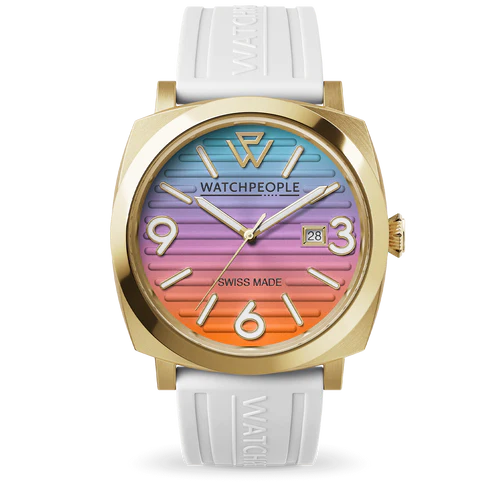 The WP2 Metal Gold White Rainbow is a bold timepiece that brightens every moment with rainbow accents on a pure white dial, elegantly framed in gold. Its 45mm diameter gives it a modern, confident look, ideal for those who value originality with subtlety. This Swiss Made watch embodies Swiss craftsmanship excellence, while its sapphire glass offers unmatched scratch protection, preserving its beauty