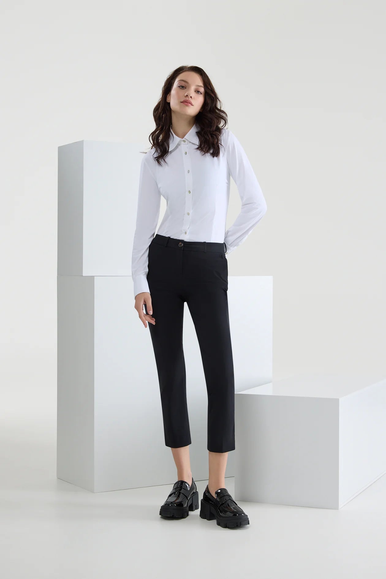 This shirt is the star of the season, and an essential item in your wardrobe. The fitted waist and high cuffs of the Shirt Oxford Wom add a note of modern femininity, while reexamining the classic male cut. The precious mother-of-pearl buttons play the high notes of refined style. The Glasgow fabric ensures the garment great elasticity, comfort and breathability.