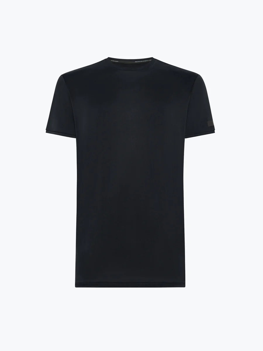 This monochrome T-shirt is crafted from a fine natural cupro fabric, tastefully embellished with the signature black micro-injected logo on the left sleeve. The regular fit is enhanced by the ultra-light and cool stretch Cupro fabric, which is soft to the touch and allows for natural movement. Its subtle sheen makes the creation an excellent choice for summer evenings, ideal for a casual yet sharp look.