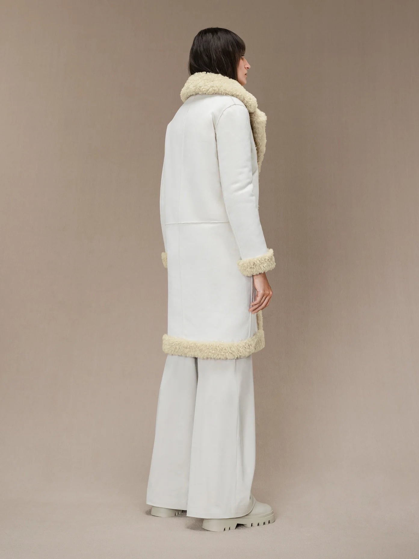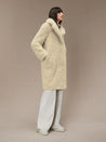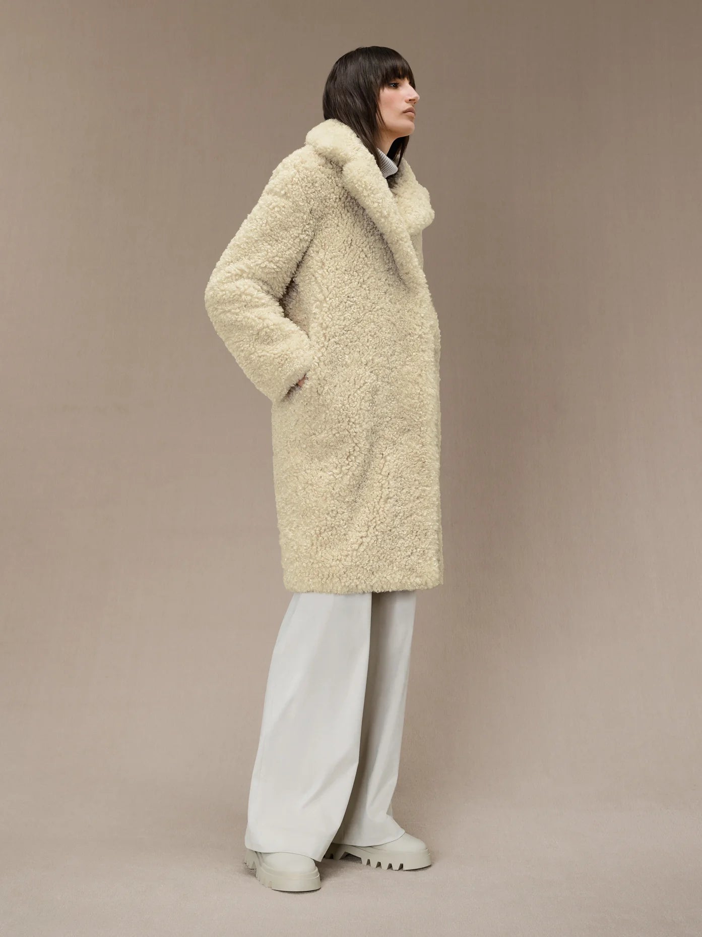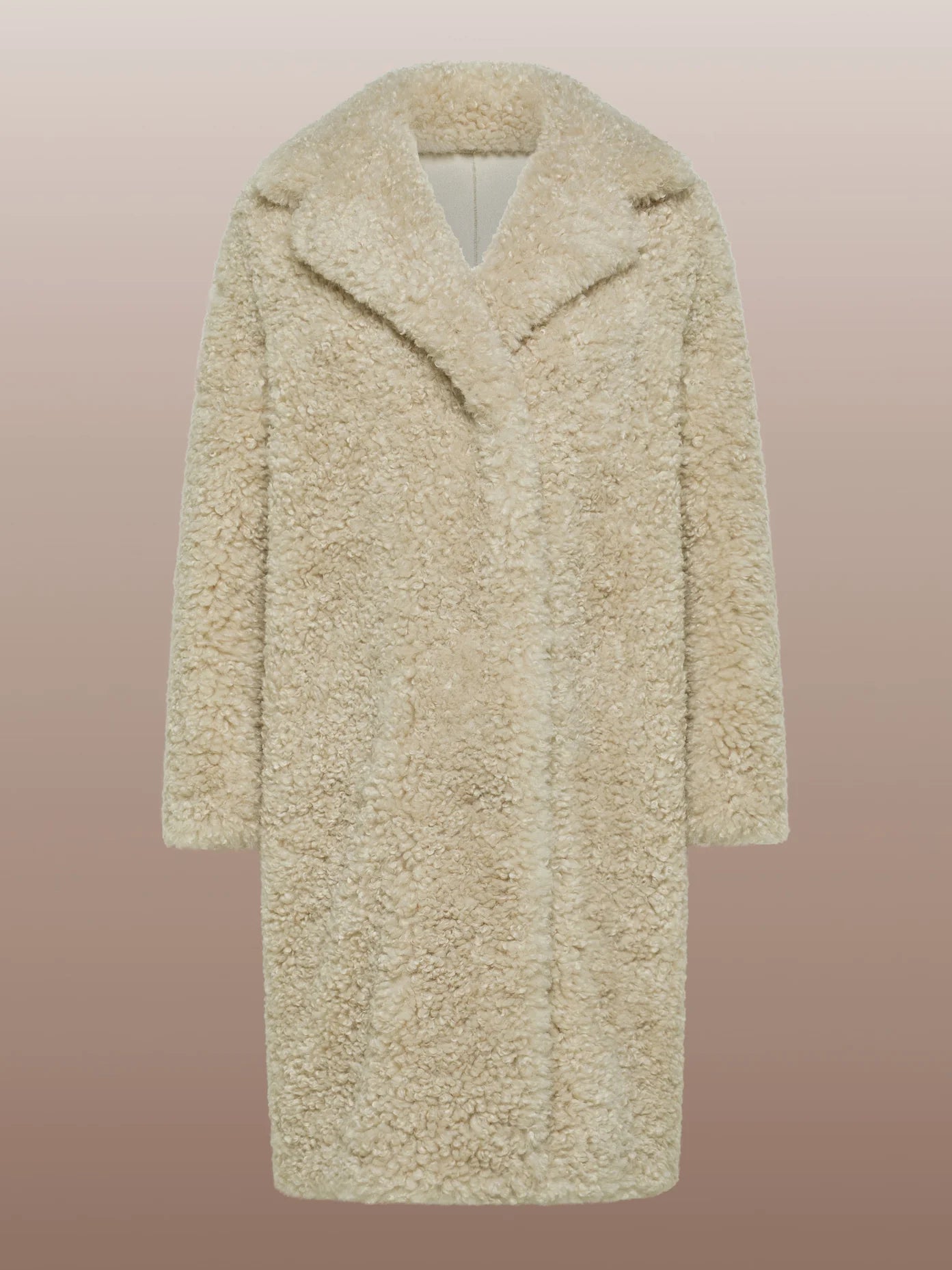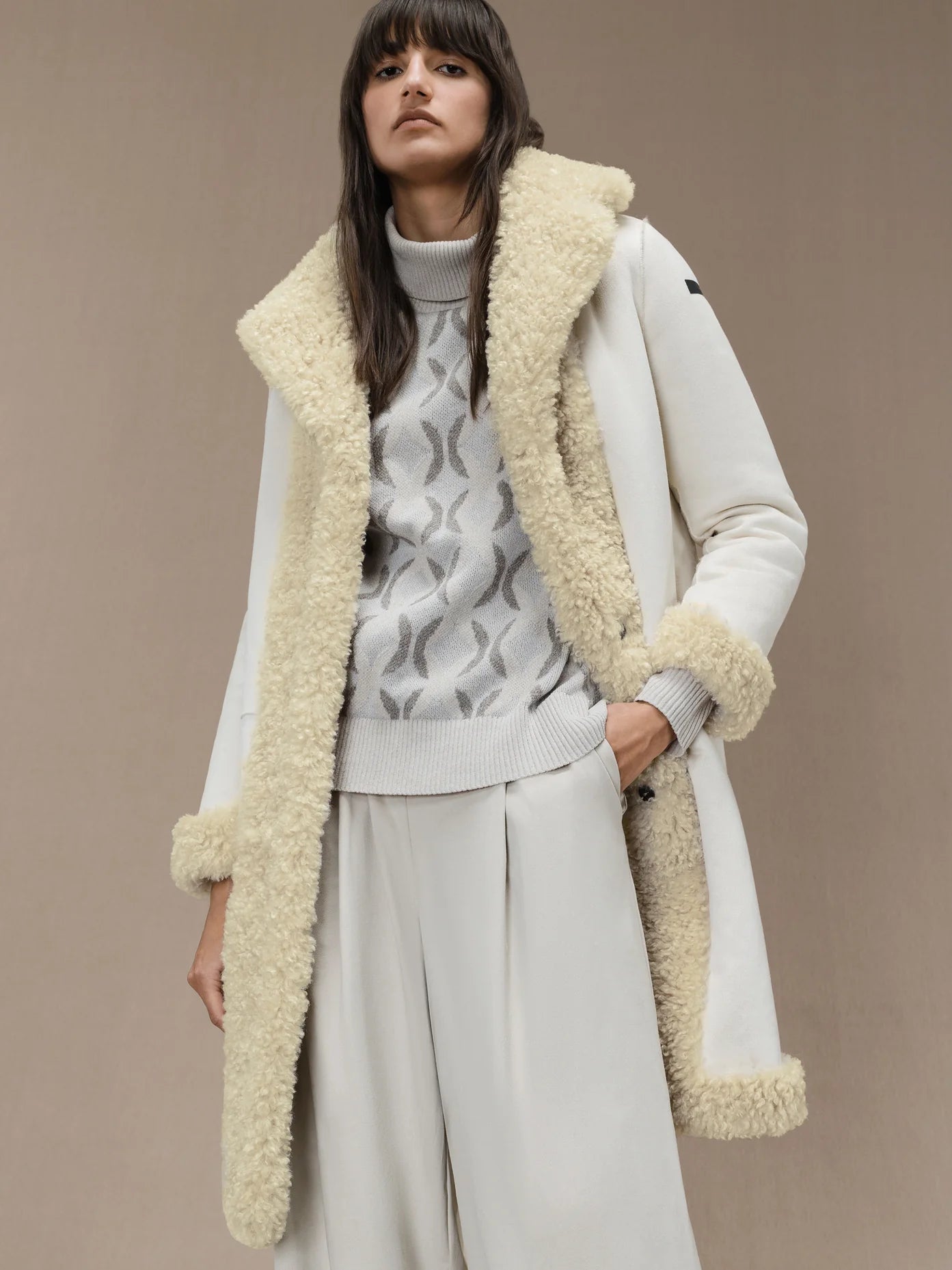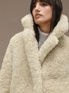 An essential piece of outerwear in a woman's wardrobe to face the cold winter temperatures with style. Crafted from reversible premium faux fur that feels like the softness of lamb's fleece, the coat offers sophisticated and versatile comfort. The defined line and mid-length wraps the body with softness and warmth, providing a sensible protection during the coldest months of the year. The concealed front closure and contrasting teddy-effect trim are distinctive details that add a touch of modern elegance. Pair it with a cable-knit sweater and wrap skirt for a chic and timeless ensemble. Black micro-injected logo on left sleeve.