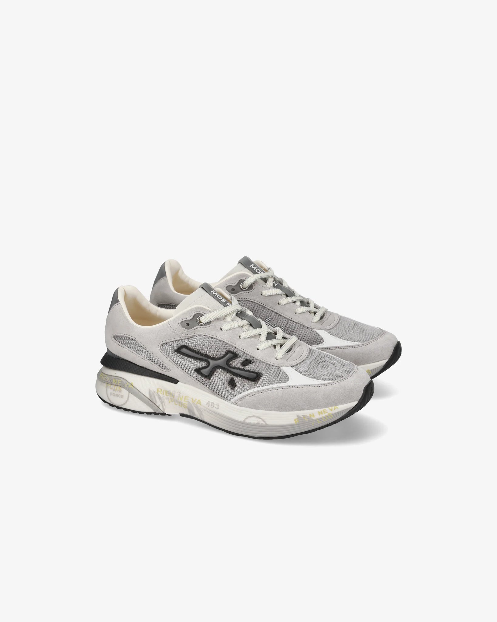 Designed to impress. The Moe run relies on the lightness of movement, stability and cushioning feel provided by the innovation of the bottom. The new silhouette is rich in details: logo on the outer side, PREMIATA lettering on the inner side and model name on the label.