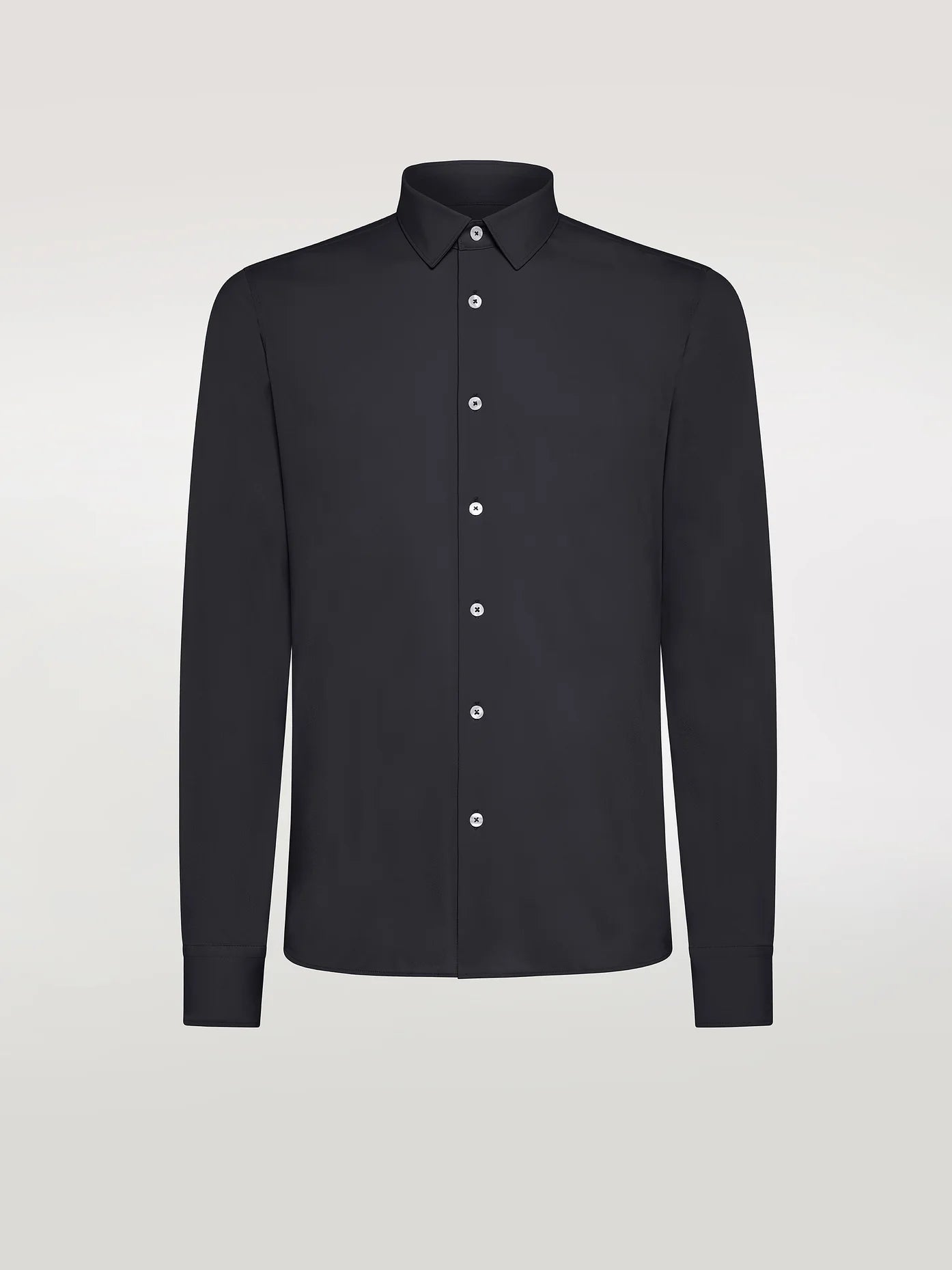 The creation is completed by the open collar and the mother-of-pearl French placket on the front, and on the cuffs. A men's wardrobe staple that can be combined with the other tailored garments from the collection.