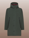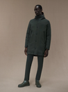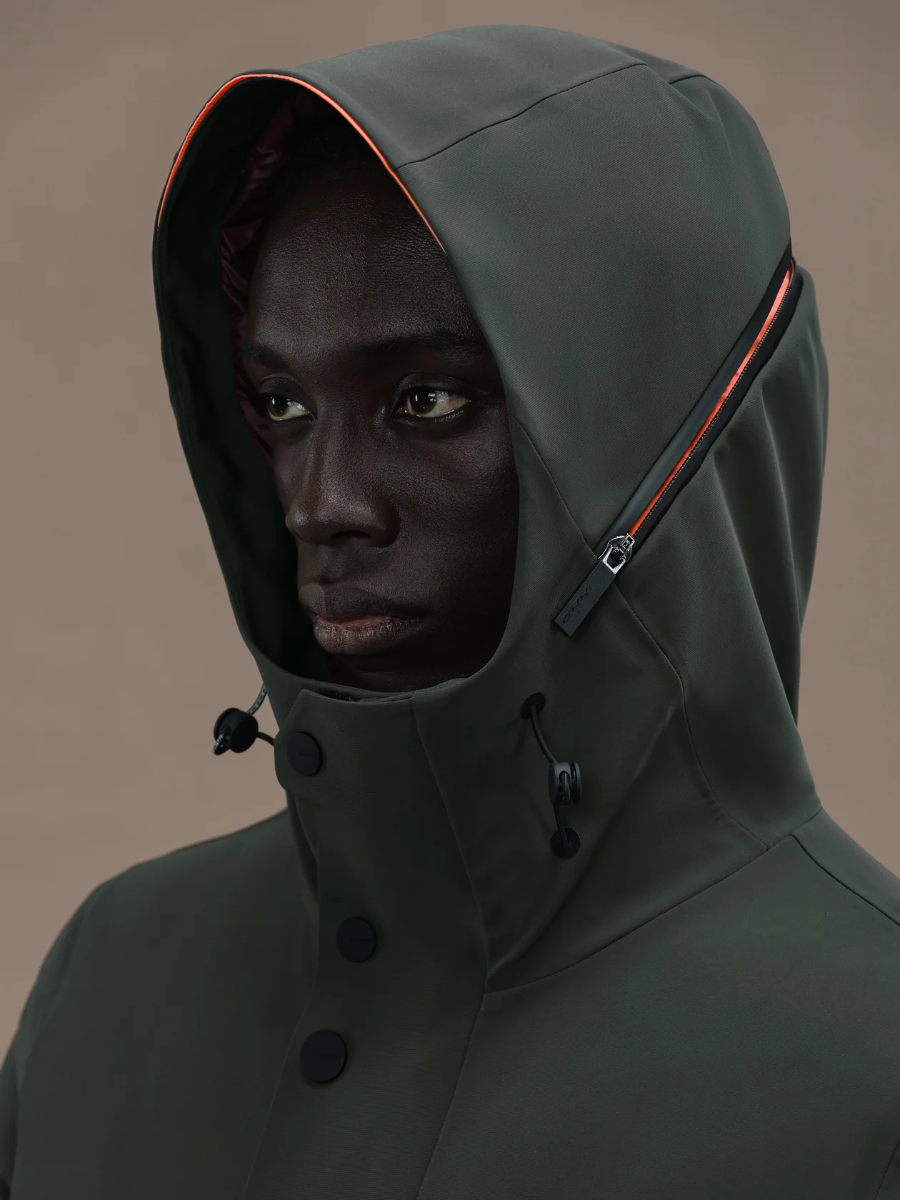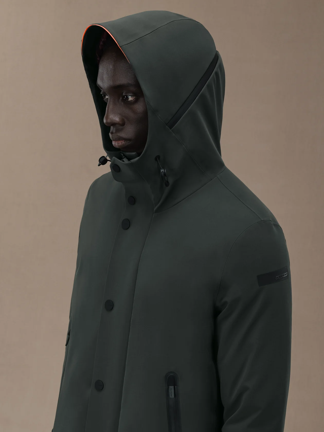 The timeless eskimo style finds new authenticity in an evocative design with a strong hi-tech character. The lightweight membrane Stratofabric#3 makes the outerwear waterproof, breathable and comfortable to wear. The interior features tubic channels padded with 90/10 duck feathers, with floating shield technology for a perfect fit. Of the two inside pockets closed by the invisible zip, the left one boasts the fluo orange double welt and the heart tag 'Made with love, designed in Tuscany'. On the front, the flap with rubberized snap buttons conceals the double slider, thermotaped zipper, rising up to close the vertical collar and the padded hood, which is elastic drawstring adjustable. This one features the hood brim and the high visibility neon orange insert, hidden by zip. The two large side pockets are closed by thermotaped zippers, while the cuffs are adjusted by press studs. The black micro-injected logo on the left sleeve is the hallmark of this successful outerwear, proposed in the dark colours of winter to get through the coldest and rainiest days in total comfort.