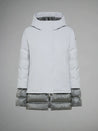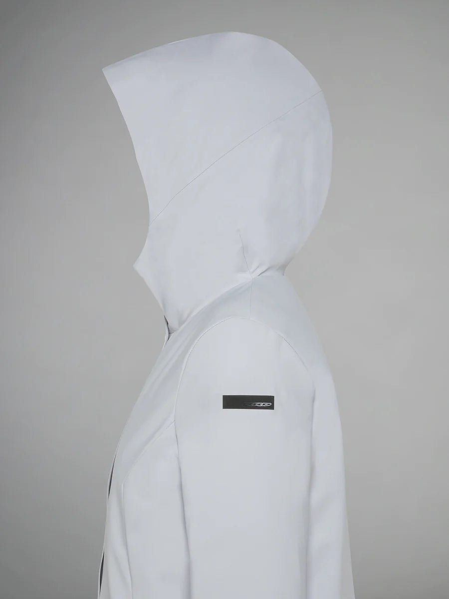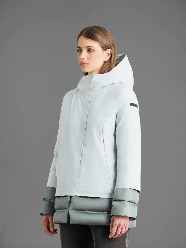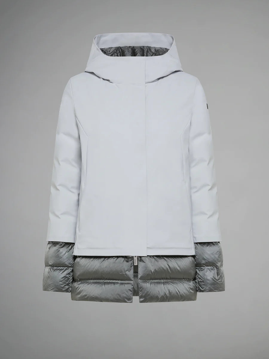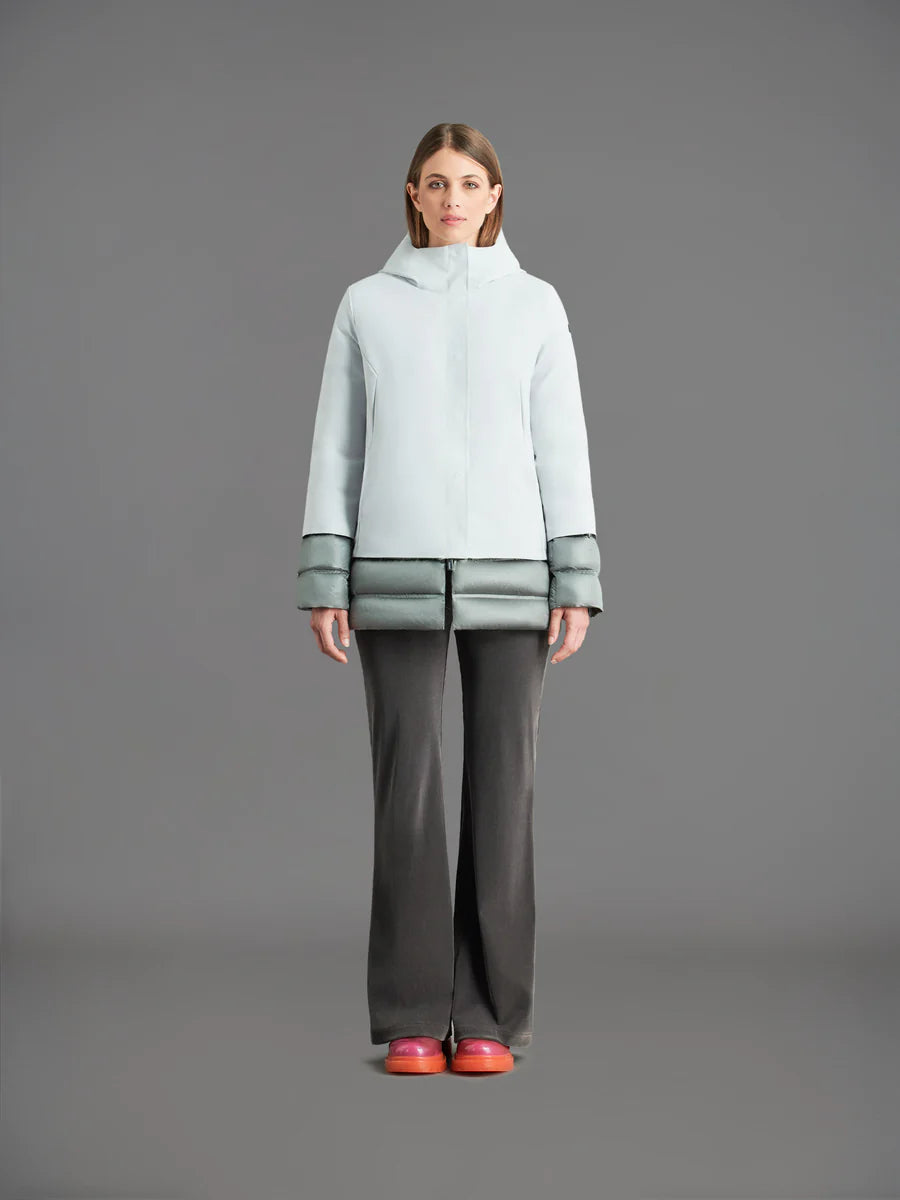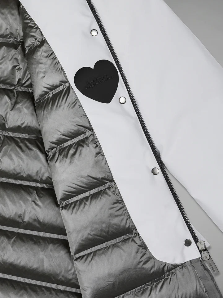 This must-have for the cold season is distinguished by the refined interplay of textiles and finishing. Comfort and elegance come together in a perfect mix of materials and style. The matt effect of the stretch SURFLEX® fabric meets the warmth and lightness of the 90/10 duck down padding with Floating Shield technology, totally seamless. The hood, invisible side pockets and the front zip concealed by the flap complete the look of the jacket. The heart transfer on the inside speaks of our passion for the design: made with love, designed in Tuscany.