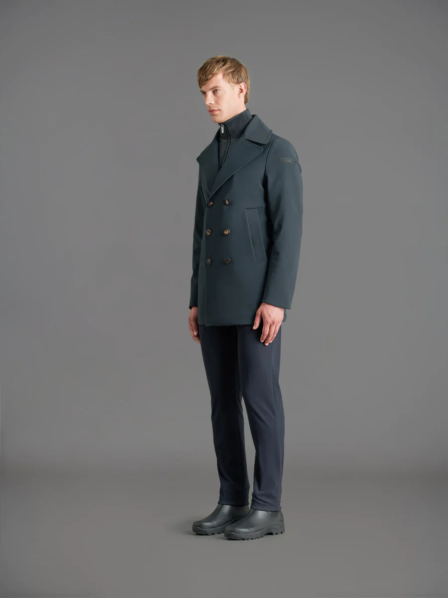 This double-breasted jacket with wide lapels is the designer heir to the undisputed male wardrobe icon, blowing from the sea. The classic peacoat takes on a more smart, modern and versatile allure with its slimmer fit and Stratofabric#3 membrane construction, plus the super matte effect of the exclusive SURFLEX® outer. The lightweight, breathable and elastic features are combined with waterproof thermo-taped stitches. The detachable padded nylon front is zipped up and rising to protect the chest and throat with the high, smock-stitched collar. Stylish details include the six horn buttons on the front, the side jetted pockets and the orange welt, inner zip pocket. Black micro-injected logo on the left sleeve.